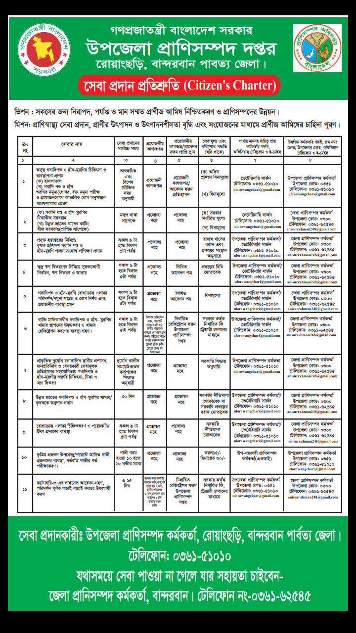 | ০১. | অসুস্থ্য গবাদি প্রাণি ও হাঁস-মুরগীর চিকিৎসা ও ব্যবস্থাপত্র প্রদান | ভি,এস | সকাল ৯.০০ টা হতে বিকাল ৫.০০টা | (প্রয়োজনে অফিস সময়ের পরে) |